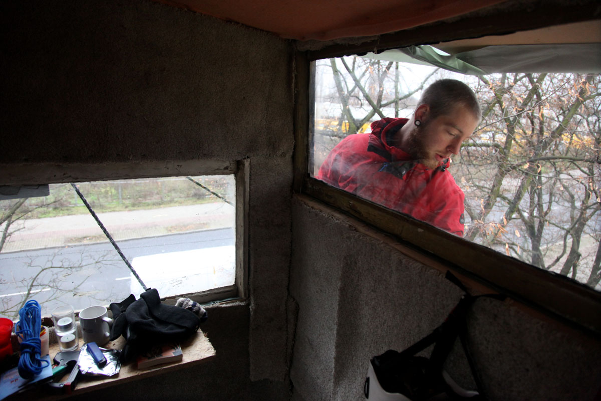 01.12.2013 / berlin / deutschland / sozusagen richtfest feierte heute ‚robin wood‘ mit seinem baumhaus in der neukoellnischen allee 33 / daniel (22) aus dresden hat zwar schon eine woche darin gewohnt, aber offiziell wurde es erst heute eroeffnet, um den aktivisten einen einigermaßen ertraeglichen winter zu bescheren / seit einem jahr sind die von der abholzung bedrohten baeume besetzt / dort solle eine erweiterung der A100 verlaufen